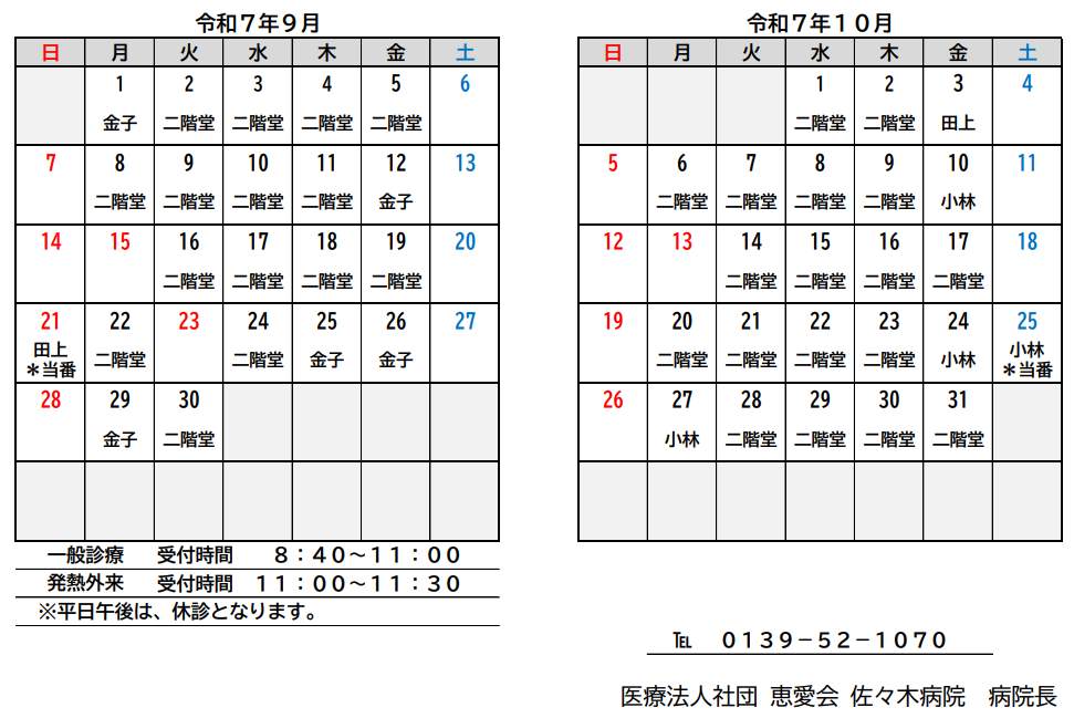 9月・10月 診療予定のお知らせ